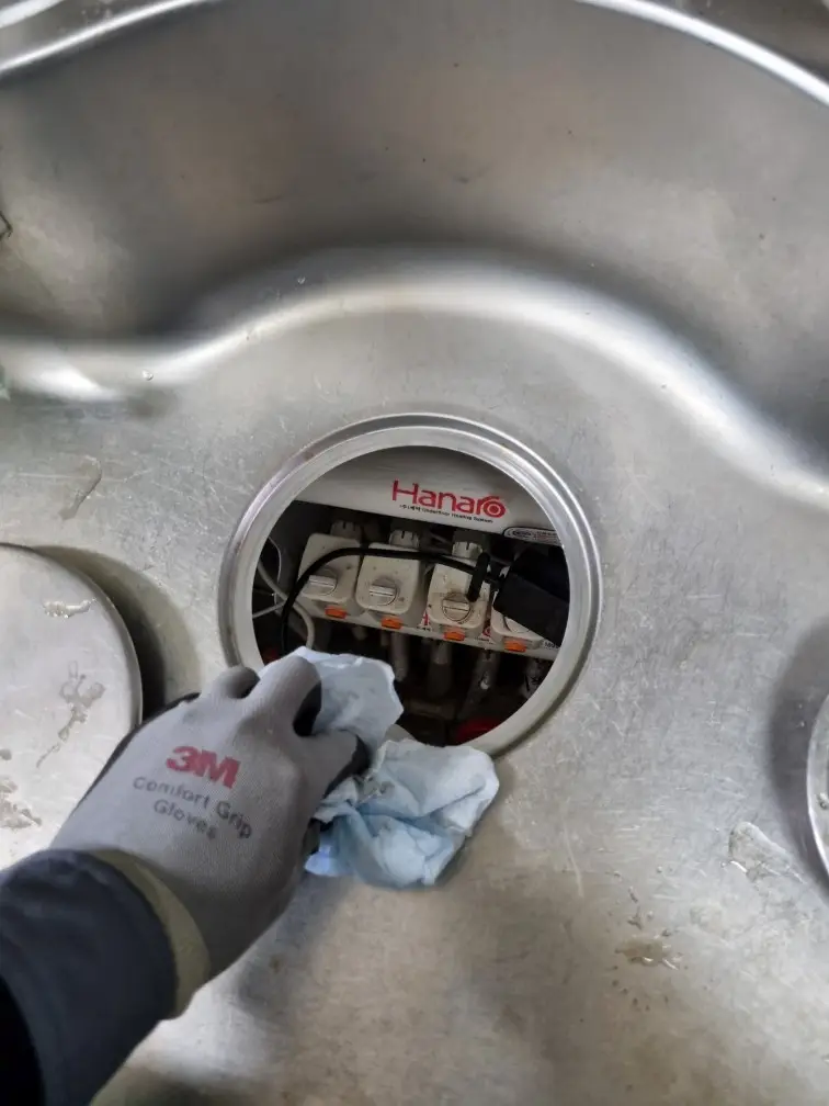 기존 배수구통이 제거되면 싱크대 배수구 주변을 깨끗하게 청소합니다. 오래된 실리콘이나 기름때, 음식물 찌꺼기 등을 완전히 제거해야 새 배수구통이 제대로 밀착됩니다. 청소 시 싱크대 표면에 스크래치가 생기지 않도록 주의해야 합니다.